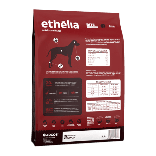 Composition: fresh chicken 30%, fresh pork 25%, rice 25%, fresh fish 10%, beet pulp 7,5%, brewer's yeast 0,5%, eggs, carrot, spinach, apple, olive oil, chicory, rosemary, coriander, turmeric